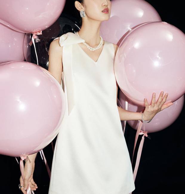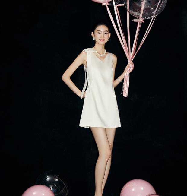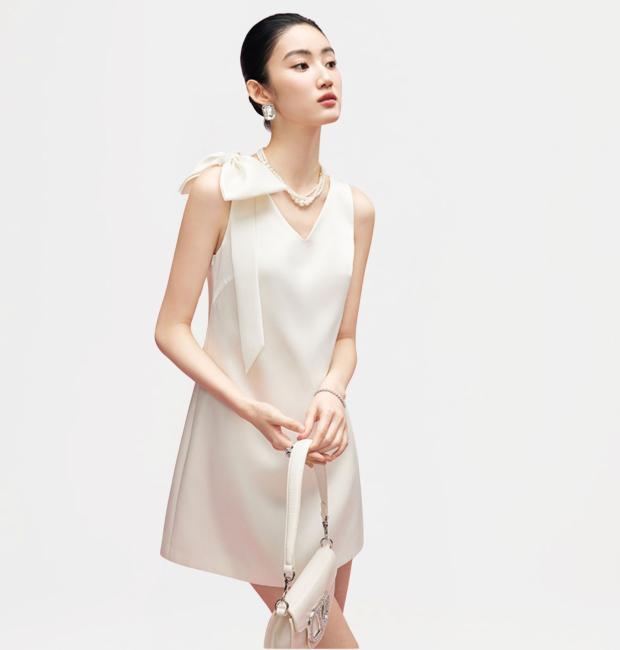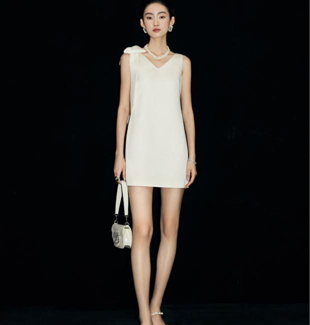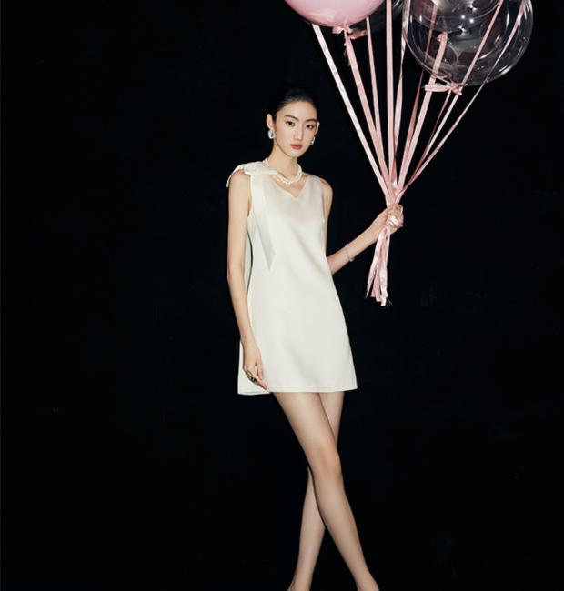 Chất liệu lụa tuyết 2 da cao cấp đứng phom, nhẹ nhàng lướt trên cơ thể, trong khi phom dáng chữ A kinh điển khéo léo tôn lên vóc dáng. Điểm nhấn đắt giá nằm ở chi tiết nơ vai lệch bất đối xứng – một nét chấm phá đầy tinh tế và cuốn hút, giúp tôn lên bờ vai thanh tú và xương quai xanh quyến rũ.