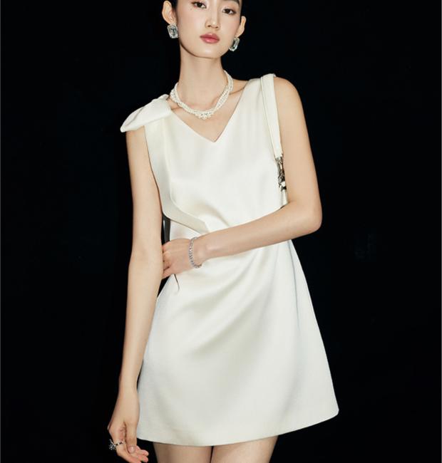 ĐẦM LỤA NƠ VAI THE AUDREY DRESS DÁNG CHỮ A CAO CẤP - VÁY TRẮNG NGÀ CỔ V ĐI TIỆC SANG TRỌNG_KAYLIN