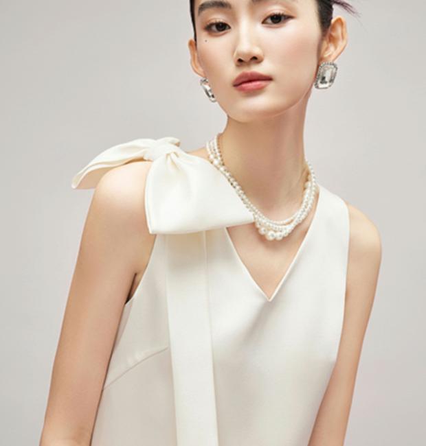 Điểm nhấn: Nơ vai lệch bất đối xứng được chế tác thủ công, tạo nên nét độc đáo và cuốn hút.