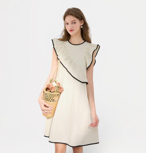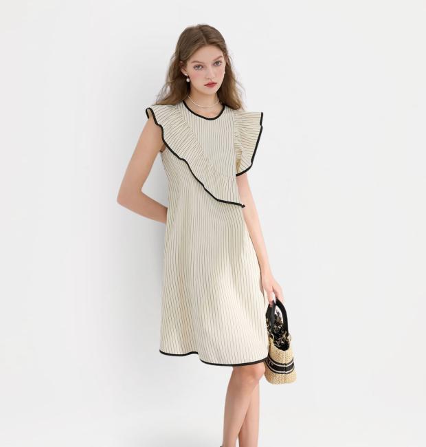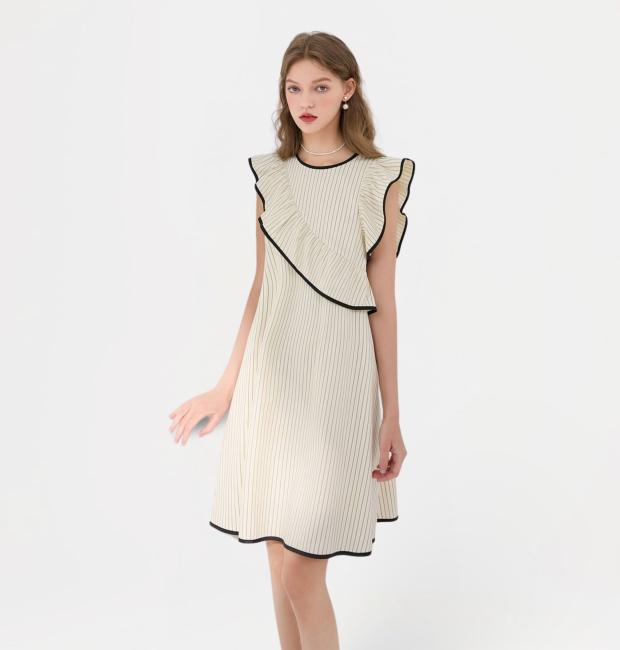 Thiết kế đầm suông dáng A nhẹ nhàng với gam màu kem phối sọc đen cổ điển, giúp tôn lên vẻ ngoài thanh thoát và nữ tính cho người mặc. Điểm nhấn nổi bật chính là phần bèo lệch vai phối viền đen, tạo hiệu ứng thị giác tinh tế và cuốn hút.